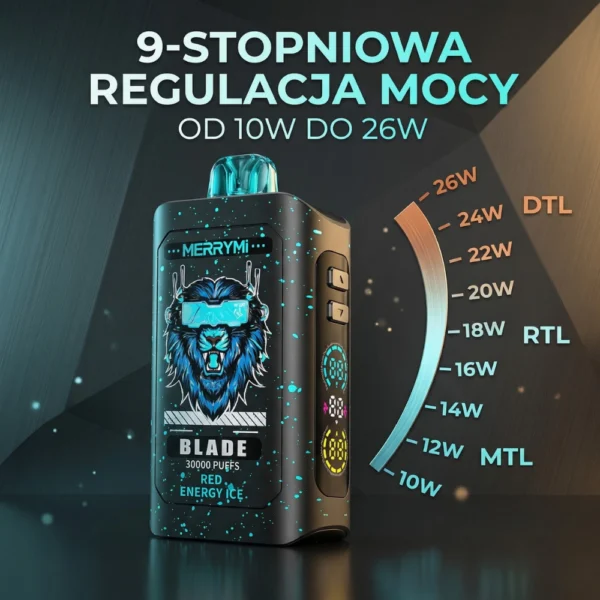 MerryMi 30K (Blade) to obecnie najbardziej zaawansowany e-papieros jednorazowy dostępny na rynku. Ten nowoczesny vape oferuje aż 30 000 zaciągnięć (puffs), co czyni go liderem wydajności w swojej kategorii. Wyposażony w inteligentny ekran LED, ogromną pojemność 26 ml e-liquidu oraz unikalną 9-stopniową regulację mocy, pozwala na pełną personalizację każdego zaciągnięcia. Jeśli szukasz niezawodnej jednorazówki o dużej pojemności, postaw na wydajność MerryMi, która wyznacza nowe standardy w technologii wapowania.